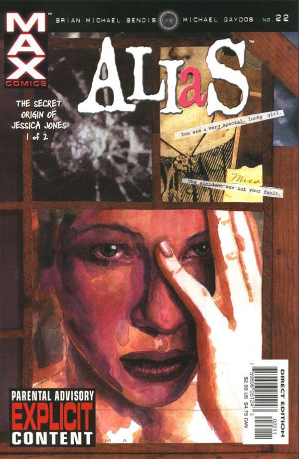 Para o grande público Jessica Jones só se tornou conhecida a partir do seriado. Quem acompanha os últimos 20 anos dos selos Marvel já esbarrou com a heroína, seja acompanhada pelos Novos Vingadores, Homem-Aranha, Demolidor ou em sua própria história. Lançada em novembro de 2001 pelo selo inédito MAX Comics, ALIAS apresenta a personagem em um cenário um pouco atípico das linhas editoriais principais da Marvel. Em clima noir, Jones é uma detetive particular que detesta seu passado como super-heroína, mas sem abdicar totalmente de sua influência e amigos daquela época. Sua rotina é basicamente tentar não ser presa, um autoflagelo aqui, uma interação nihilista e, claro, chafurdar a vida de algum cretino, indicado por qualquer cliente que paga bem para saber os podres de seus parceiros e parentes.